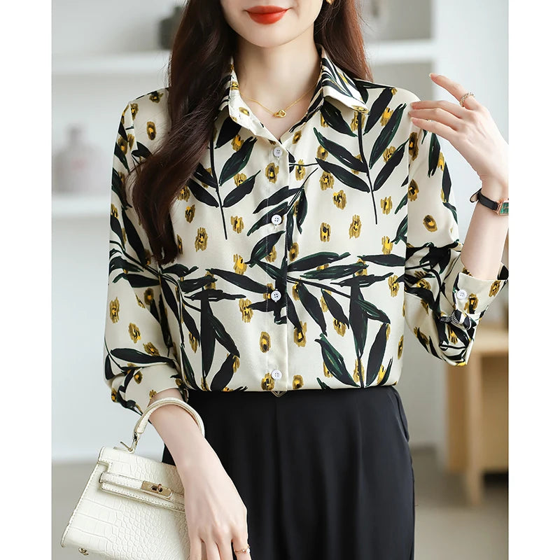 2025 Spring Autumn New Office Lady Blouse Fashion Floral Printed Shirt Turndown Collar Med-Length Long Sleeve Women Tops