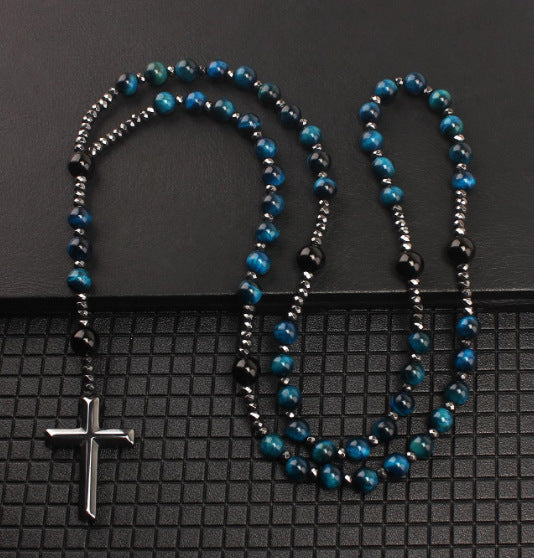Natural Round Beads Long Chain Haematite Cross Beads Men's Necklace