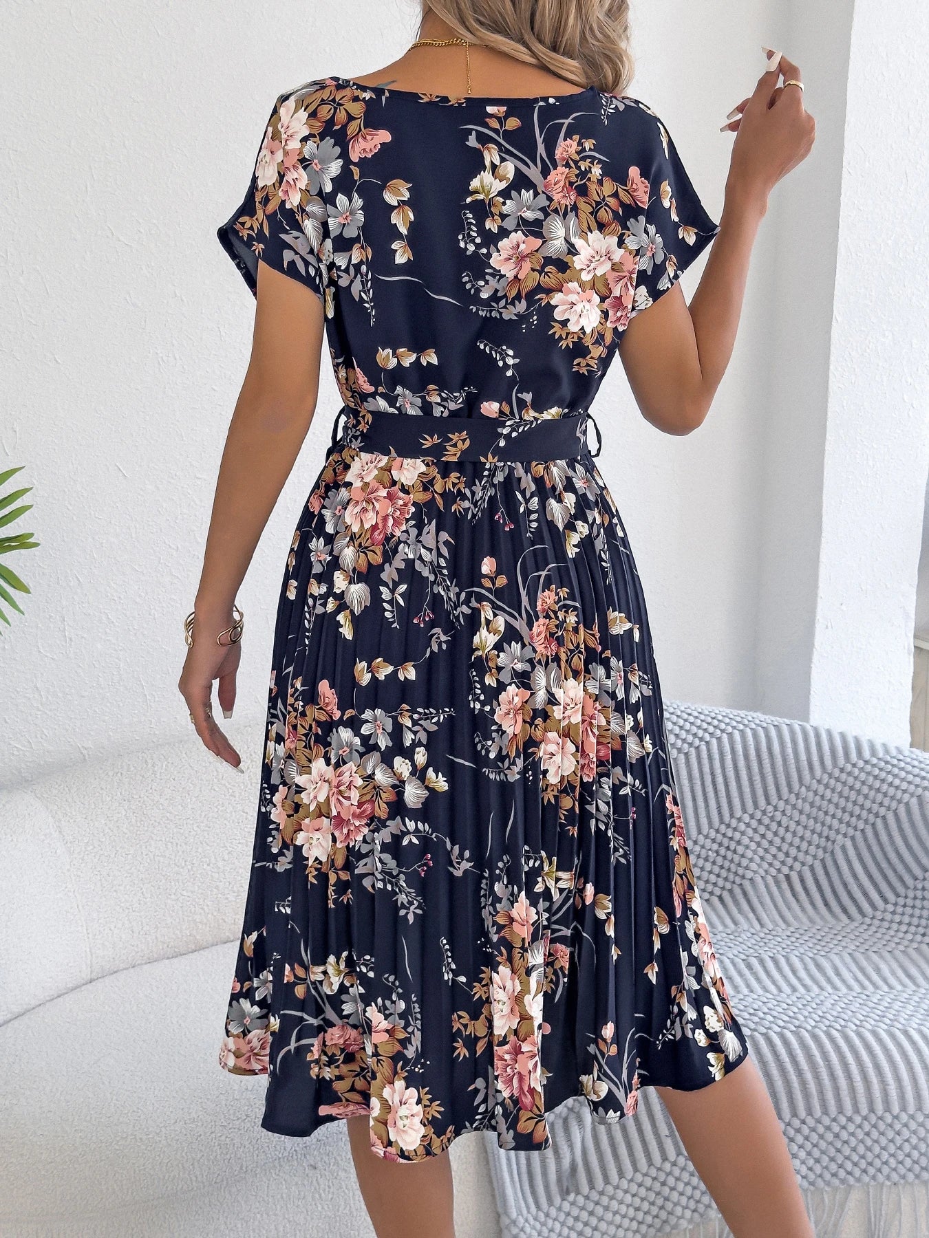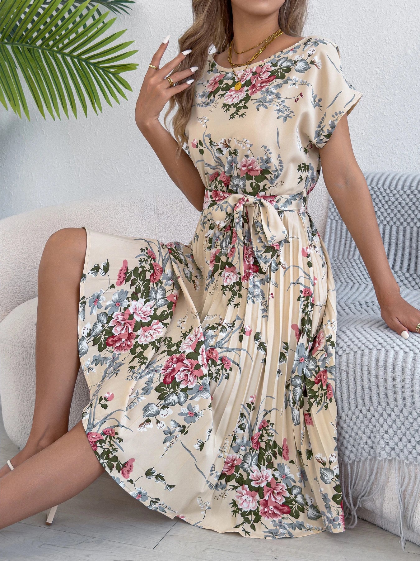 2025 Retro Floral Pattern Printed Dress Woman Elegant Spring Summer Round Neck Lace Up Short Sleeve Dress