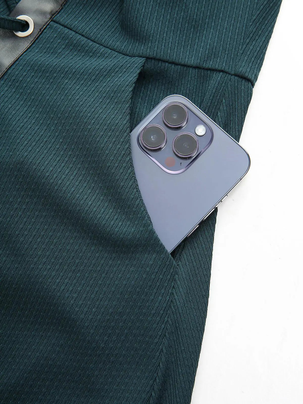 ROSEGAL Plus Size Lace-up Grommets Hooded Lace Trim Split Dress Women Autumn Winter Deep Green Long Sleeves Casual Dresses