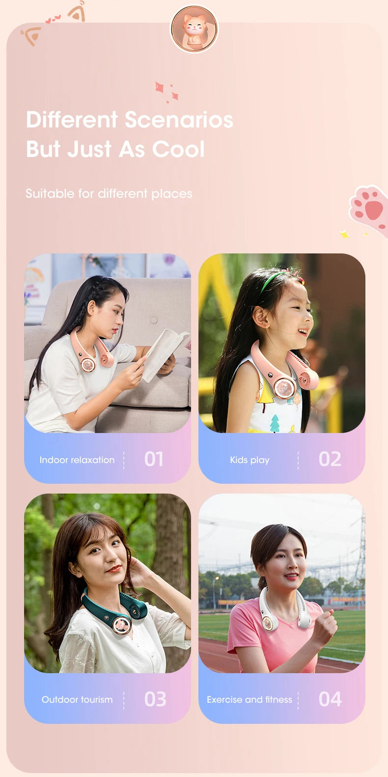 Bladeless Neck Fan 2000mAh USB Rechargeable Digital Display Cute Cat Hanging Mini for Travel Office