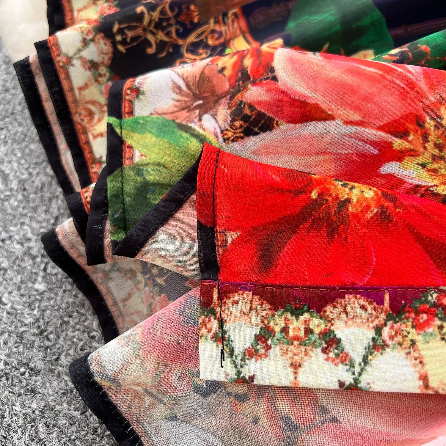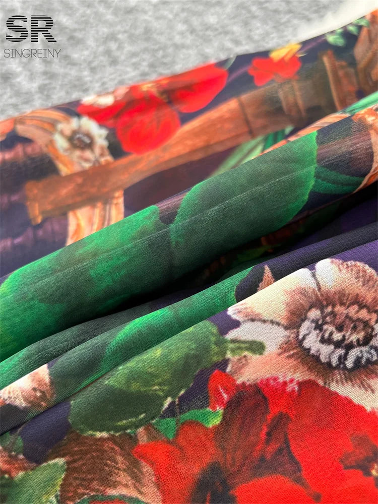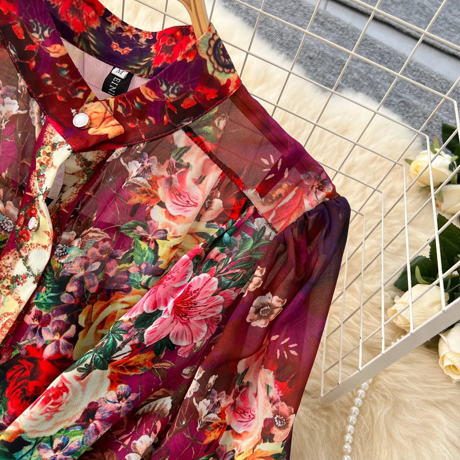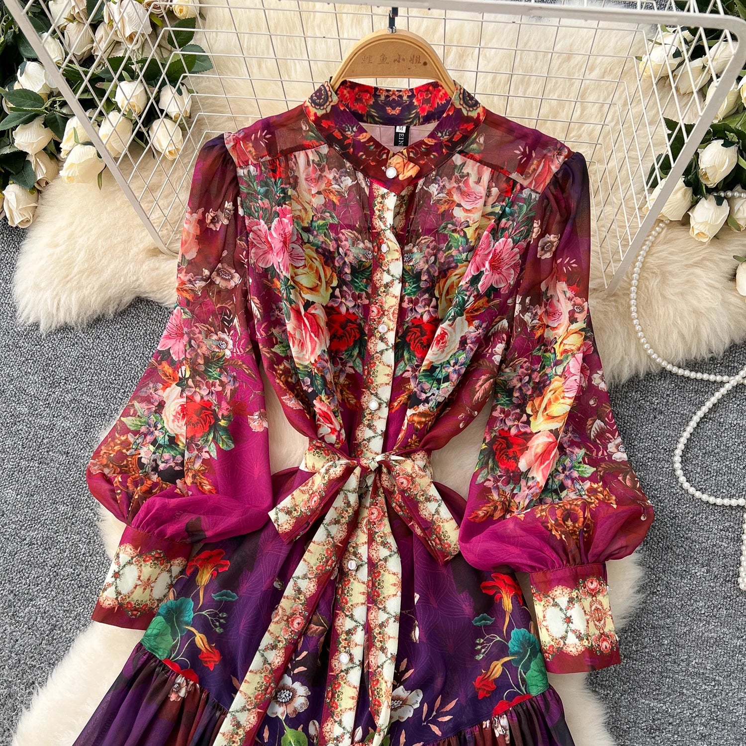 SINGREINY Vintage Print Chiffon Dresses Women Lantern Sleeve O Neck Design Fashion High Quality Court Floral Pleated Long Dress