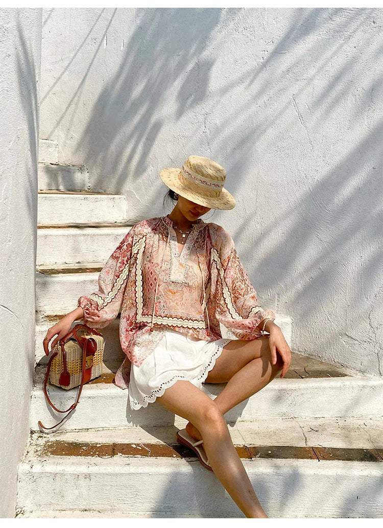 Boho Flrench Chic Floral Blouse Shirt Printed Summer Loose Lace Hollow Out Sexy Ladies Vocation Women Long Sleeve Top Shirts New