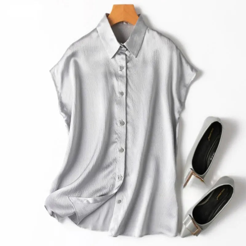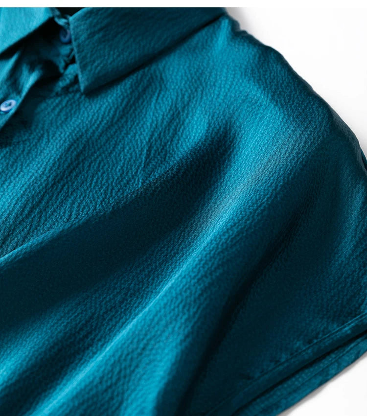 Women 100% Mulberry Silk 20 momme Heavy Silk Peacock Blue Collared Short Sleeve Buttons Down Shirt Top Blouse office work MM567