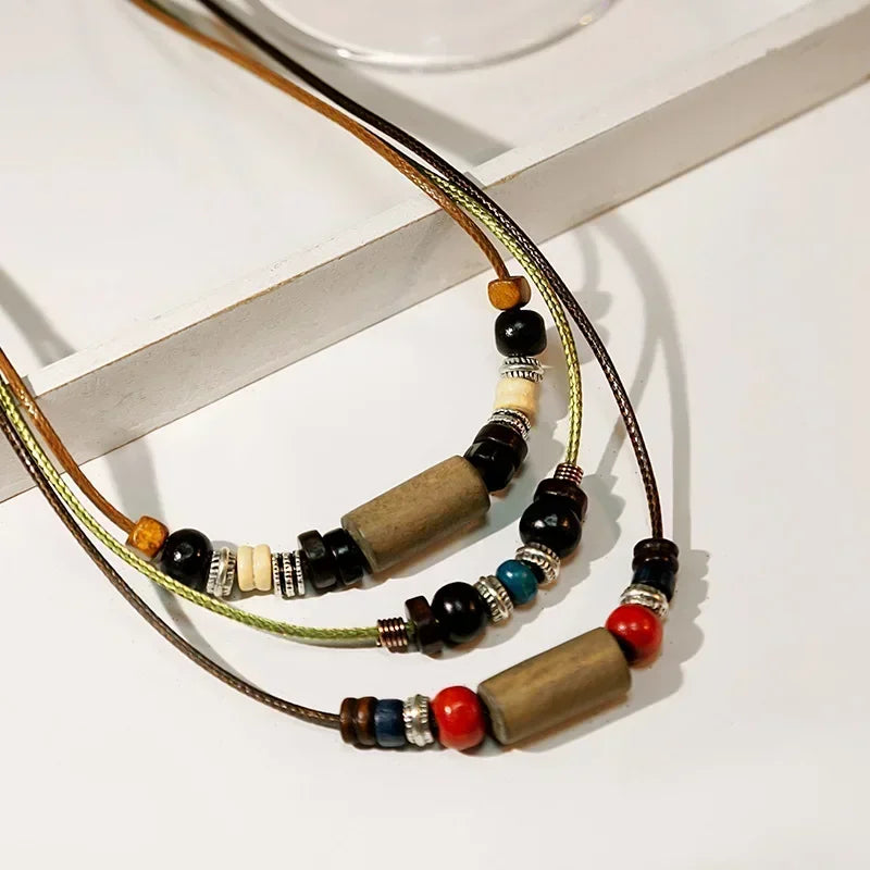 Men 2 Layers Leather Rope Necklace Vintage Fashion Retro Creative Natural Wood Layered Pendant Charm Wax Rope Faux Leather